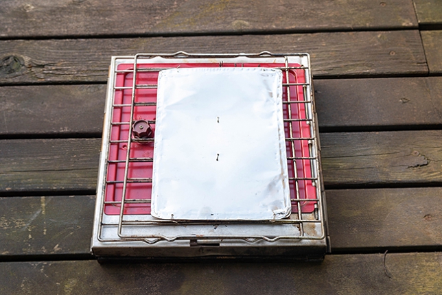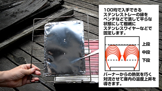 キャンプオーブンに設置した状態です。棚網を2枚着けるときは横にして着けると楽です。隙間なくアルミホイルで塞ぐともっと効率よくなります。