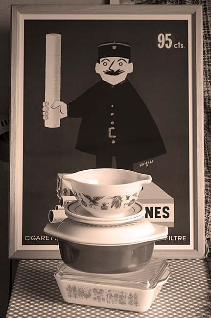 写真の食器はPyrexの60〜70年代に米軍のカフェテラスで使用されていたブルーバンドというプリントネームのサラダプレートです。2重のブルーストライププリントが特徴であります。