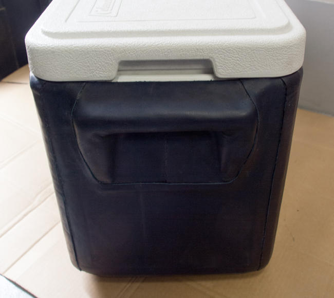 革素材はこのサイズのクーラーボックスならもう1個加工できるくらいで3,400円でした。作業時間6時間(汗