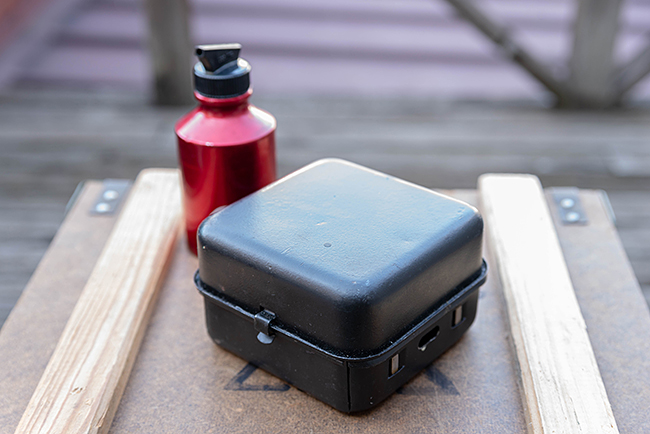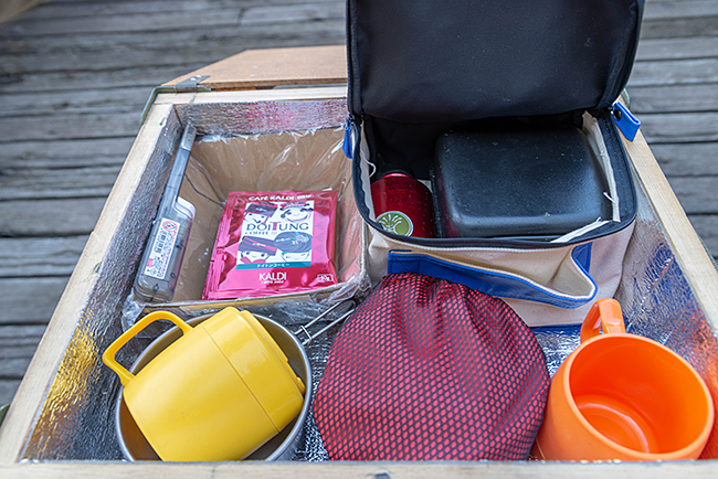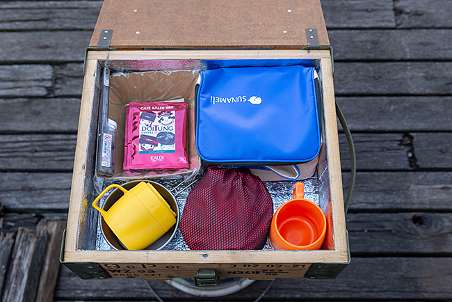 中にはDYNEXのマグ2個、ロッキーカップ、箱ストーブと燃料ボトル、ケトル、ドリップコーヒーパック、スナック菓子を入れる為の紙皿なんかが入ってます。