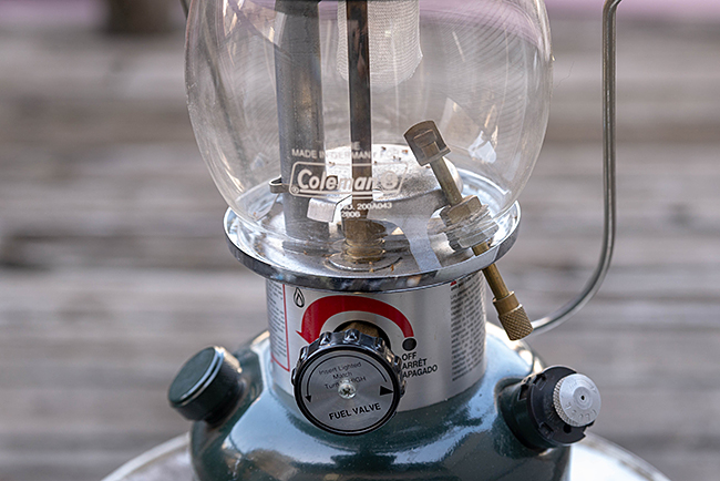 このランタンにはスパークイグナイターを装着してライター不要で点火できるようにしています。ポンピングしてからバルブホイールを開いて生ガスが出始めたらノブを指で素早く回転させるとイグナイターの先端からジッポーライターの様な火花が発生してそのまま点火できる仕組みになってます。何も考えずに使える優等生です。明るさは286Aなどと同じ200cpと言われており、200や200Aの300cpより劣ります。