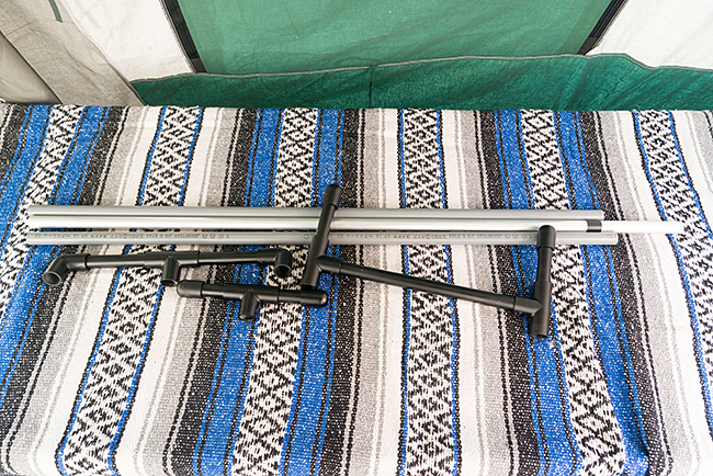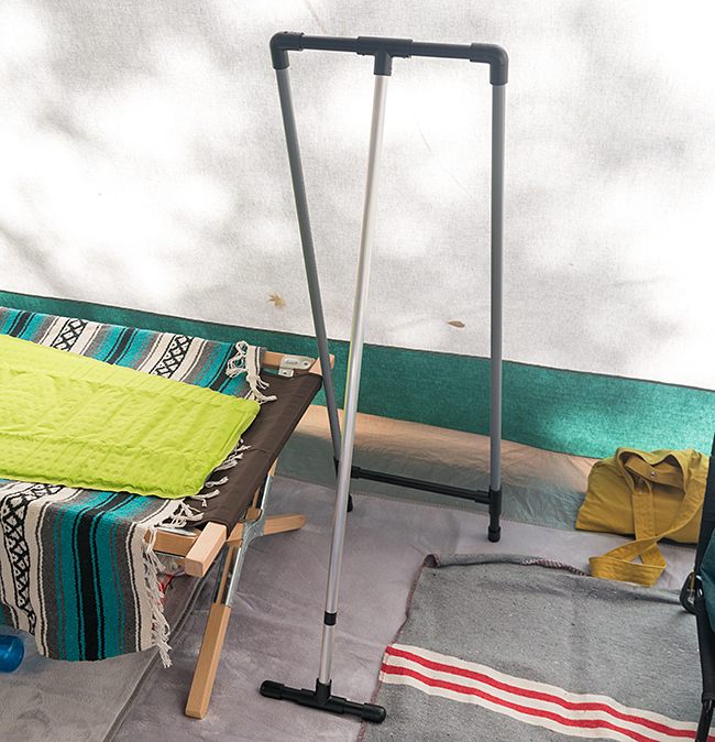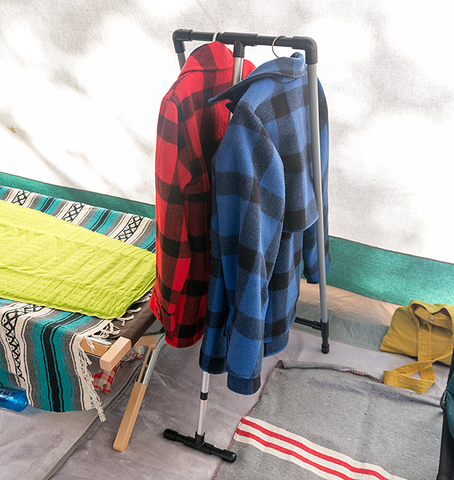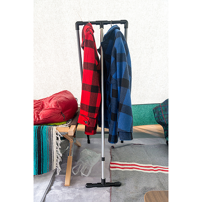 水道管に使われる塩ビパイプとHillarytentの予備ポールを塩ビパイプのジョイントで組み合わせてます。青いバッファローチェックはfilsonのダブルマッキーノクルーザーで約3kgの重さが有ります。赤い方はjohnsonwoolenmillsのマッキーノジャケットで此方はそんな重くありませんが、2着掛けても全然大丈夫です。他に、帽子を掛けたり、タオルを掛けたりと使えそうです。