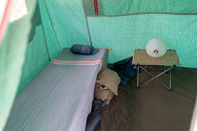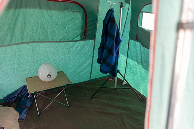 内部は一人で使うとやはり広いです。自立式のランタンスタンドをコートハンガーに使用しました。一人なら中でローテーブルを使っても良いですが、今回は外にしました。