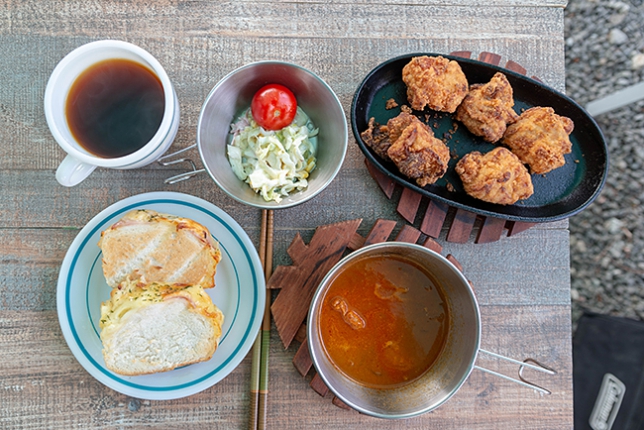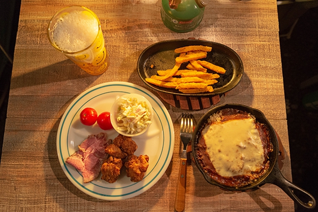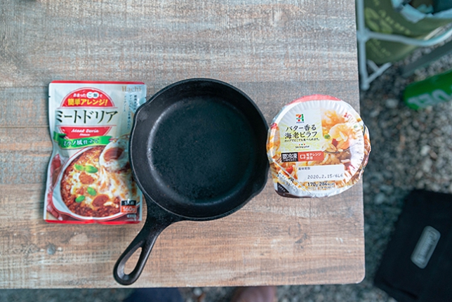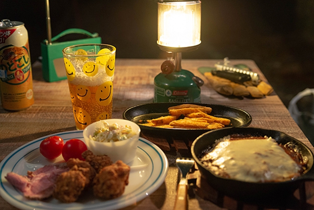 ソロキャンプだとキャンプ飯が適当になるか、逆にすごく凝ってしまうかですが、今回はその中間くらいかしら。オーブンでミラノ風ドリア、唐揚げ、ポテトフライを焼きました。