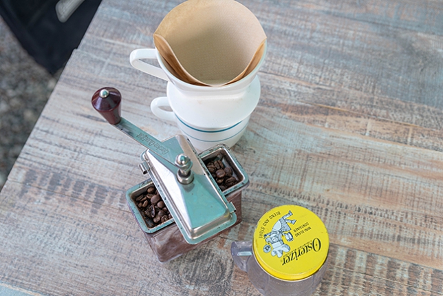 キャンプの朝はコーヒーから。一人なので直接カップにドリップです。