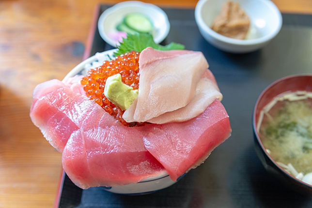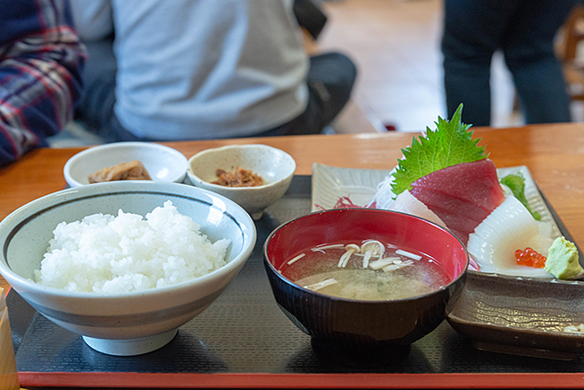 日替わりでネタの変わる三色丼をオーダーしました。この日はマグロ、ハマチ、イクラです。切り身は大きくて美味しいんですがご飯盛りすぎです(汗 奥様は刺身定食でしたが、こちらはわりと普通っぽい感じでした。