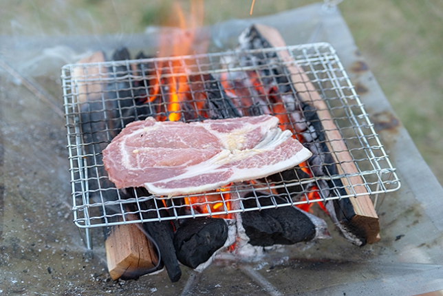 焼きます。強火で両面を焼いて完成。余分な油が落ちて良い感じに!あと焼きおにぎりも焼いてテントに持ち込みます。