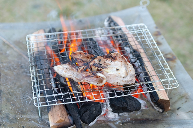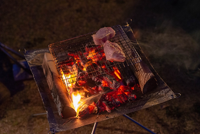 焚き火台に木炭を火入れして直接焼いちゃいます。