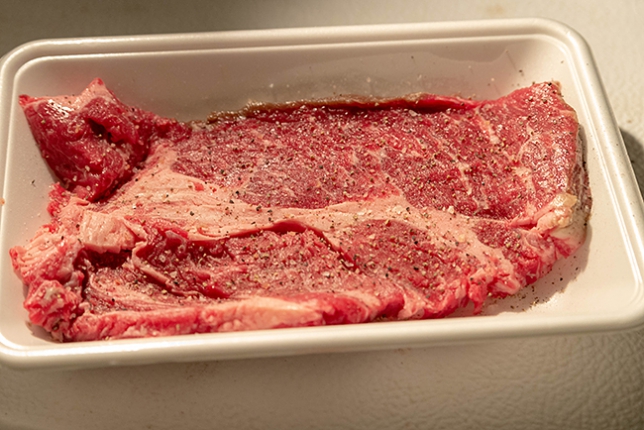 最後は牛サーロインステーキです。ステーキに西京味噌を塗って焼くというのは意外にも料理家のレシピがあるんですが、魚と同じように長時間漬け込むというレシピ。我が家では塩コショウしてから西京味噌を塗って