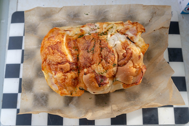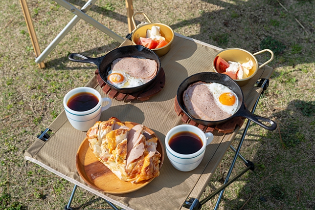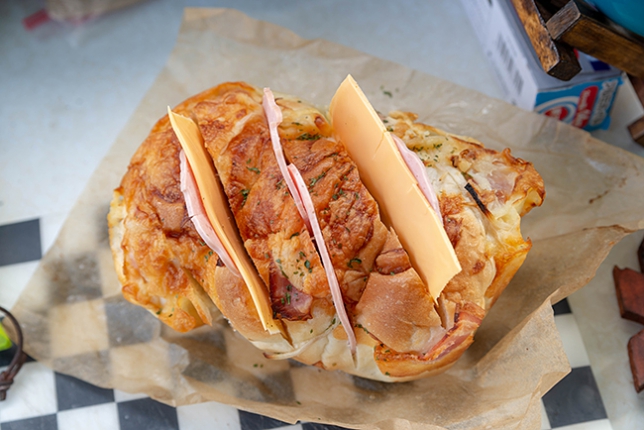 斜めに切れ目を入れてハムやチーズを挟んで、キャンプオーブンで更に焼きます。