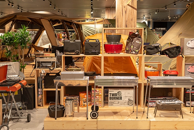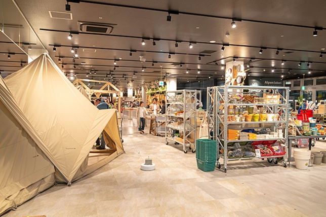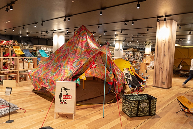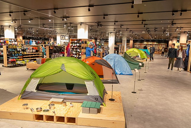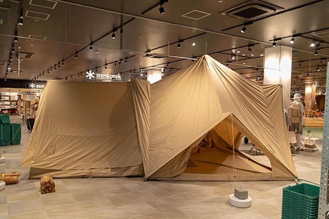 1階はオートキャンプ全般で、ファミリー向け大型テントや各メーカー毎にブースが設けられた売り場となってます。テントやファニチャーの展示も多いです。