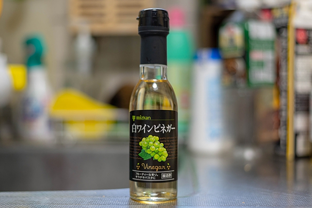 白ワインビネガー50ccにリンゴ酢20cc、岩塩2つまみ、オリーブオイル大さじ2をよく混ぜ合わせて、ボウルに入れて混ぜ合わせます。
