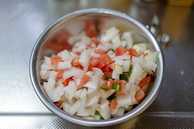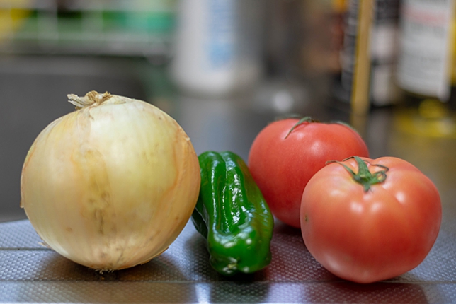 材料は玉ねぎ 1/2(今回は新玉ねぎを使いました)、トマト2個、ピーマン1個をそれぞれ5mm角くらいのみじん切りにします。(他のレシピではもっと細かくみじん切りにするみたいです。)あと、これは好みによりますが、ニンニク1片をみじん切りにします。