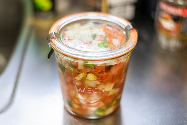 ガラスの容器に入れて冷蔵庫で冷やします。今回はWECKのガラスキャニスター500mlを使いました。