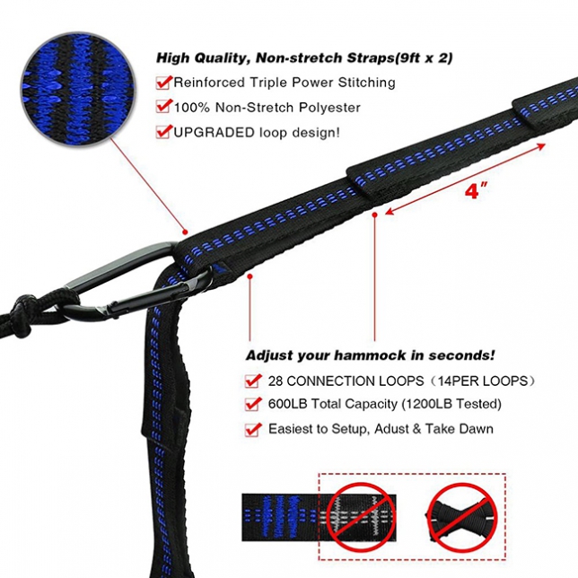 耐荷重1.2Tのカラビナと耐荷重1000lb(450kg)のハンモックベルトも付属してました。上の写真の商品は普通バージョンで、購入したのはデラックスバージョンという商品です。他の商品と比較する場合、この辺りのアイテムをチェックしたほうが良いでしょうね。
