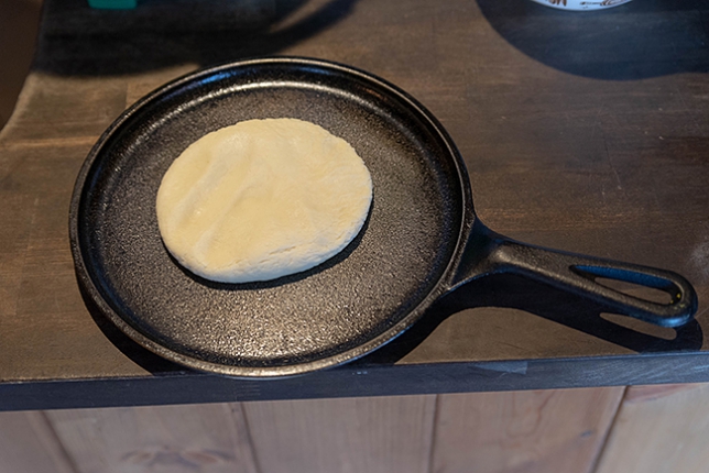 解凍したピザ玉を手のひらで伸ばしながら広げます。このピザ玉はイースト菌が使われてないのでそのまま使えます。18cmで通常のピザ、20cmでクリスピーとなるようなのでラウンドグリドルの内径20cmまで広げます。