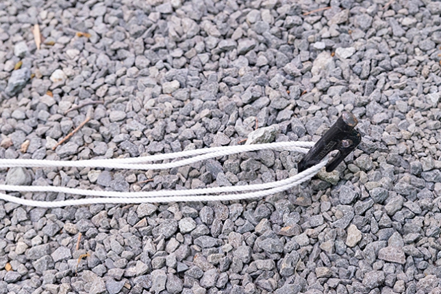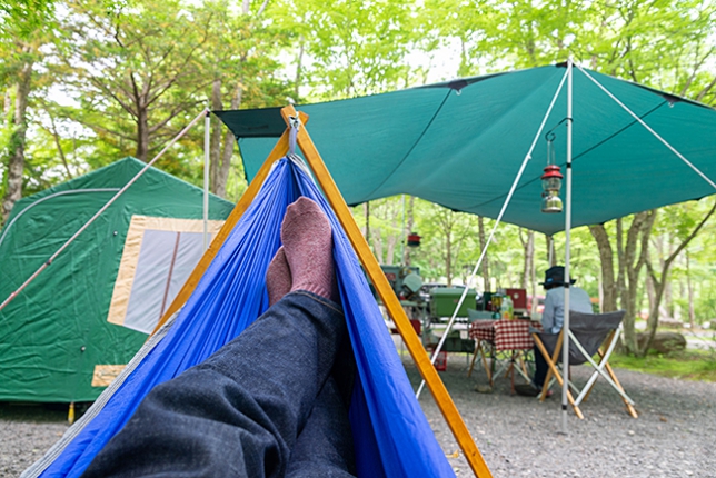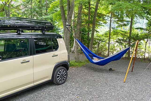ハンモックは木と木の間に設置するか、自立式のハンモックスタンドに設置するか、今回のハンモックスタンドのように片方を木やクルマのラックに固定して、もう片方をハンモックスタンドに固定するという方法があります。