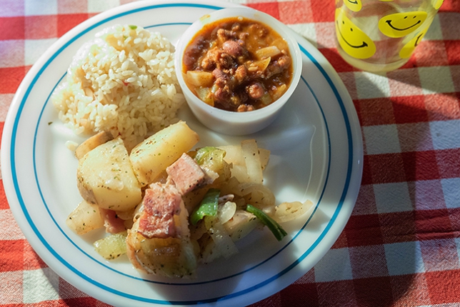 今回は新じゃがと新タマネギ、ピーマン、ベーコンを使ったジャーマンポテトにポークチリビーンズ、ピラフのワンプレートディナーです。