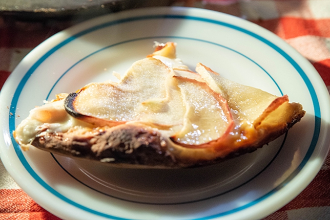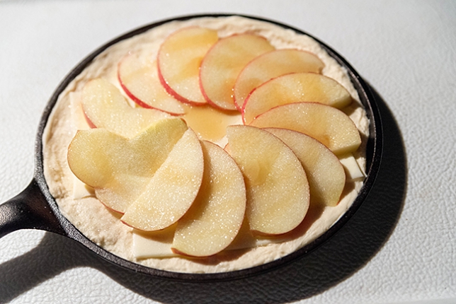 スウィートグラスで薪ストーブで作ったハニーアップルピザをキャンプオーブンで作ります。生地の上にモッツァレラチーズ、そして林檎のスライス、ハチミツを2周くらい掛けてからグラニュー糖をまぶしてオーブンで焼きます。