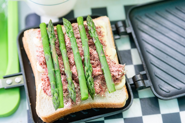 あさごはんはコンビーフとアスパラガスのホットサンドと