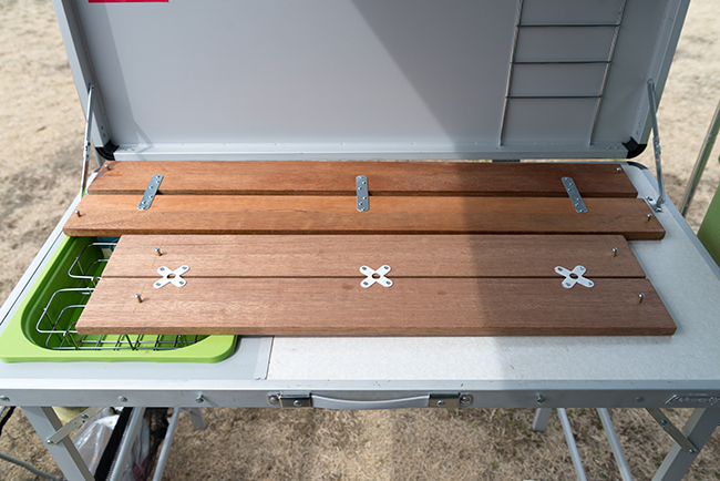 これら全てを天板の内部に収める為に幅をギリギリまで詰めて内側にストッパーを設けてずれ落ちないように工夫しました。