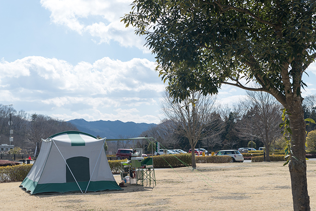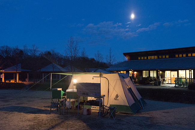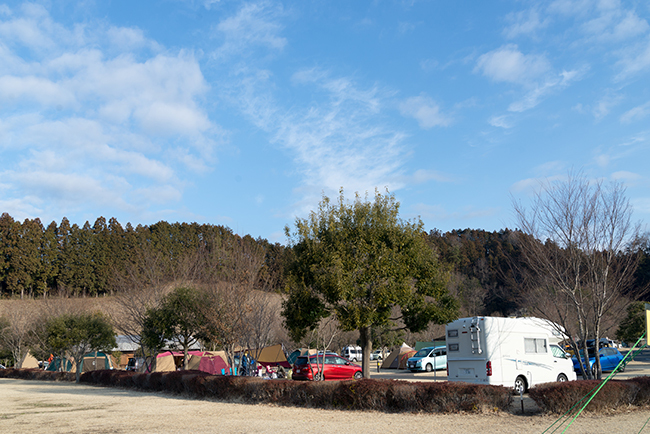 今回はフリーサイトを利用しました。フリーサイトはサイトエリア周辺の駐車スペースにクルマを停めて設営するわけですが、クルマのすぐ近くに設営してしまえば電源が使えないだけで区画サイトとなんら変わりはないようにも思えました。