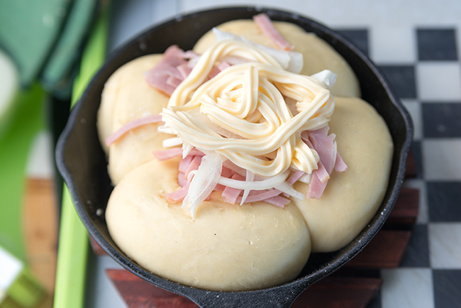 オニオンベーコンブレッドには生の玉ねぎスライスにベーコンの細切りを混ぜて載せたところにマヨネーズをトッピング