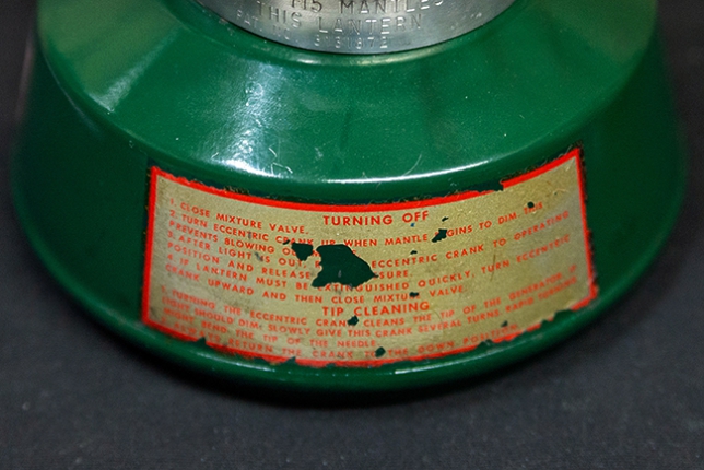THERMOSのグリーンのランタンやストーブにはこの金色が下地のデカールが貼られてます。転写シールの上からトップコートのクリアが塗られていると思いますが、そのクリア層が薄いんでしょうね。経年劣化で剥がれてしまってる個体が多く、自分のランタンも残念な状態でした。