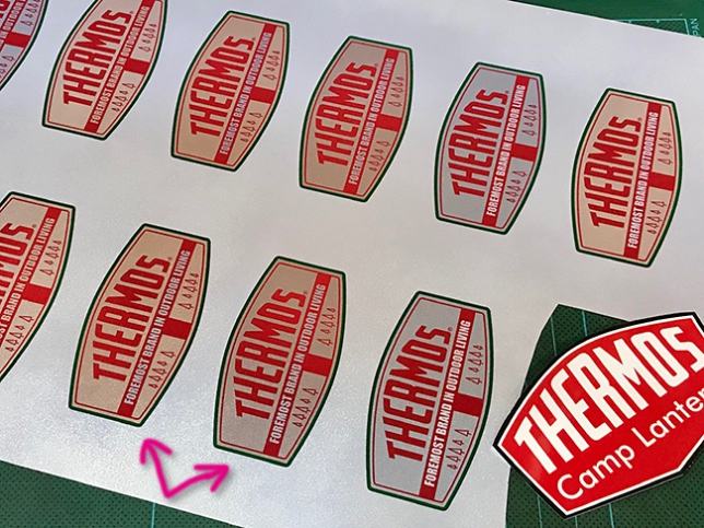 THERMOSの企業ロゴは非営利目的なら自由に使えるepsデータがネット上に有りますのでそれを利用するとして、ステッカーの素材が問題です。熱に強く耐油性も多少必要ですからね。