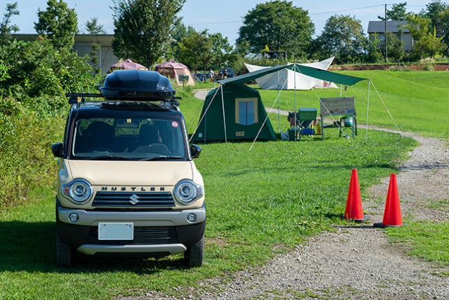 芝生内にクルマの乗り入れはできないのでハスラー君はギリギリの所に駐車します。
