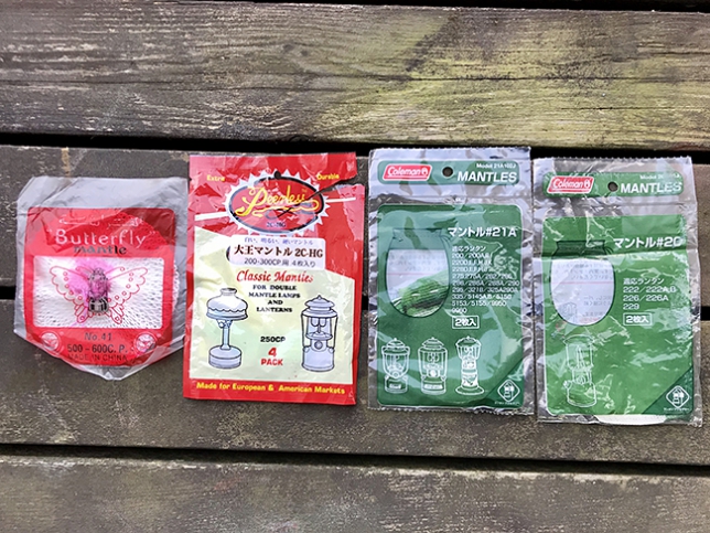 上写真は一般的なマントルの例ですが、ColemanではNorthstarは特殊な形状のマントルを使います。また、ガスランタンや一部の灯油ランタンは提灯型のマントルを使用します。