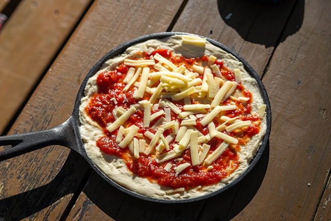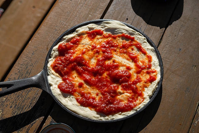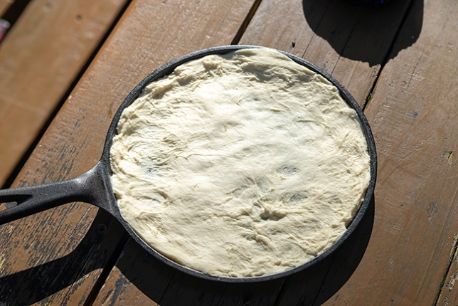 Lodgeラウンドグリドルに生地を広げます。伸ばしてから生地が膨らまないようにフォークで数カ所の穴をあけると良いですよ。