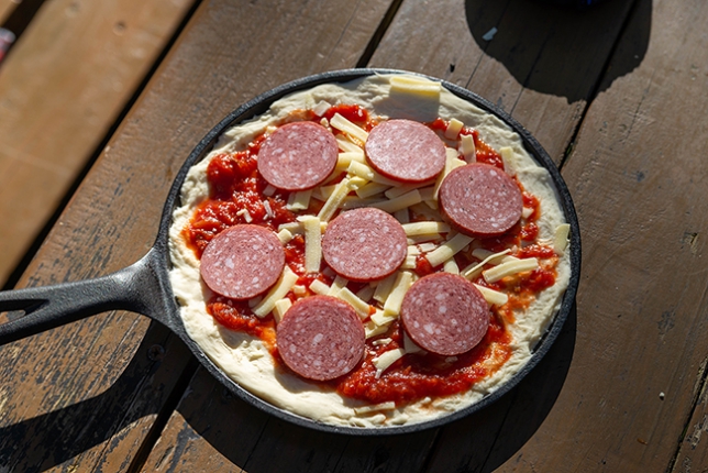 サラミはイオンの上級サラミという商品なんですが、厳密的にはカルパスなのかもしれません。大判でピザに使うと美味しいのでオススメです。これをキャンプオーブンで下段で15分焼いて出来あがりです。
