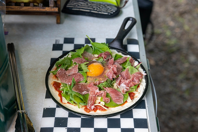 2日目の朝ごはんに食べたビスマルクピザです。ビスマルクピザは半熟卵の載ったピザの事ですが、具材に関してはバリエーションが多いです。ビスマルクは何回か作ってますが、いつも同じ具材で今回も生ハムとベビーリーフのビスマルクピザを焼きました。