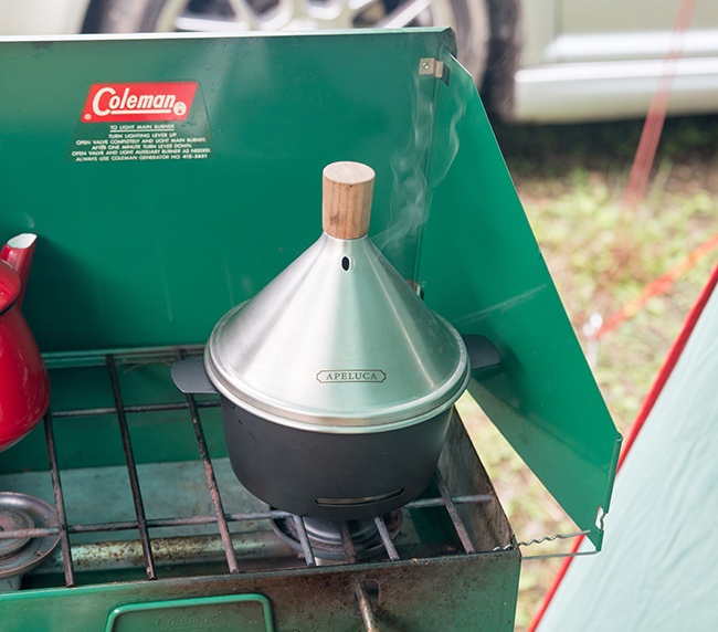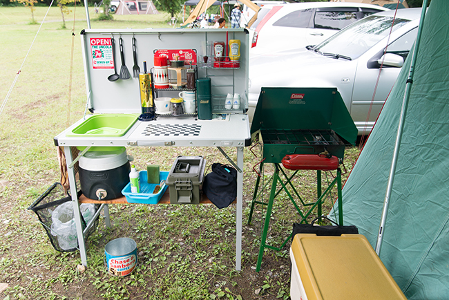 最近、使い始めたUS ColemanのPACK-AWAY CAMP KITCHENは昔のOutfitter Camp Kitchenと違ってバーナースタンドが分離できて便利です。今回はスペースが狭いのでツーバーナーはスタンドに設置しました。