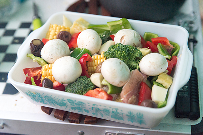 マッシュルーム、サツマイモ、ブロッコリー、トウモロコシ、万願寺とうがらし、パプリカ、ビッグニンニク、甘栗、プチトマト