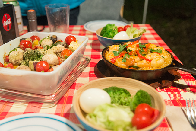 2日目の夕食はチキンと9種類の野菜のオーブン焼きと海老と剥きアサリのパエリア