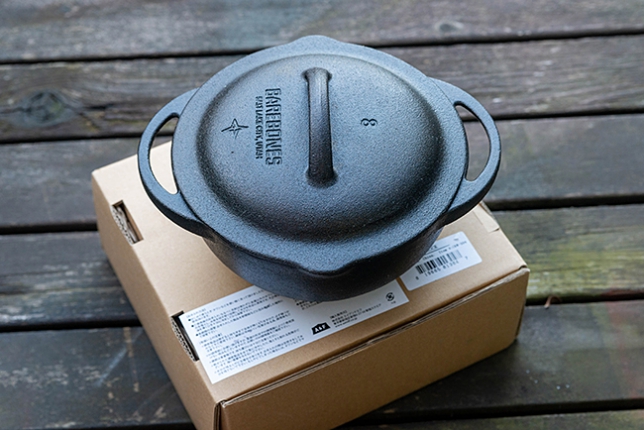 あのLEDランプが評判のBAREBONES LIVINGが発売しているクロックというキャストアイアンの鍋です。最近、Lodgeのラウンドグリドルをキャンプに持っていくようになりまして、気づいたらバスケットの中はフライパンだらけだったんです。鍋はエナメルウエアの鋳物のキャセロールを持っていくこともあったのですが、どうせならスキレットやグリドルと合わせてキャストアイアンの鍋で揃えようということにしました。8インチサイズだと直径20cmですが、Lodgeより若干軽量なBAREBONES LIVINGにしました。それでもエナメルウエアより重いです。