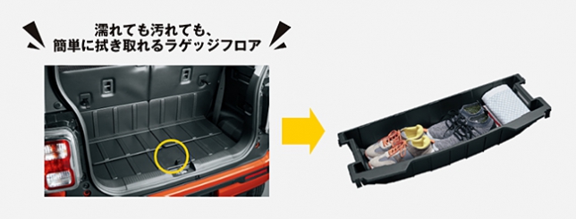 新型ハスラーのウリの一つに「どんどん遊びを積み込もう!充実のラゲッジスペース」というのが有りましてラゲッジアンダーボックスが装備されているんです。