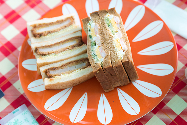 初日のランチは浅草ヨシカミのカツサンドにエビとアボカドのサンドイッチ