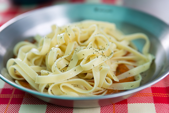 昼食はミートソースの上にパルメザンチーズとバターであえたフットチーネを載せたパスタ