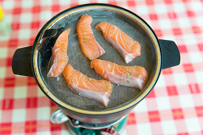 続いては、刺身で食べられるサーモン。ここからはクルミのスモークチップを使います。