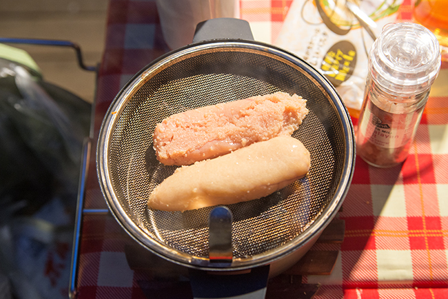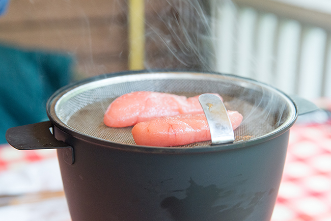 お次は生たらこ。サーモンでもタラコでも水分が出るのでチップの上にアルミ箔を載せて燻製させると酸味が出にくくなりますね。これ発見♪(´ε` )