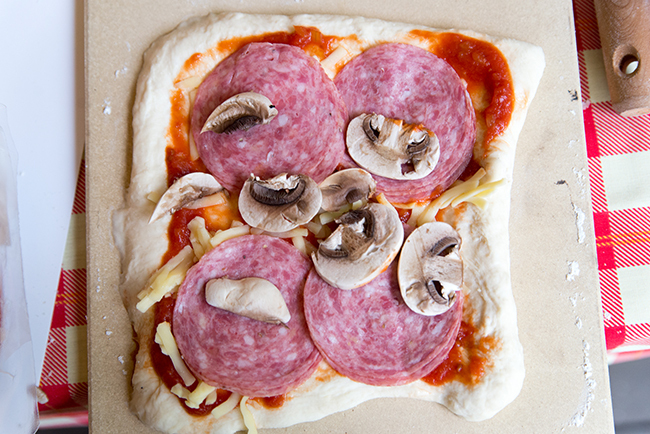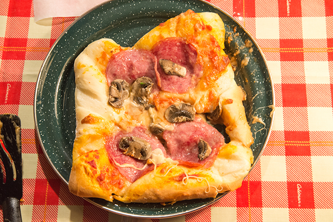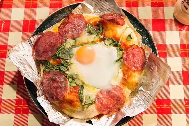 良い感じに焼けました。ピザソースはカゴメの基本のトマトソースのみです。