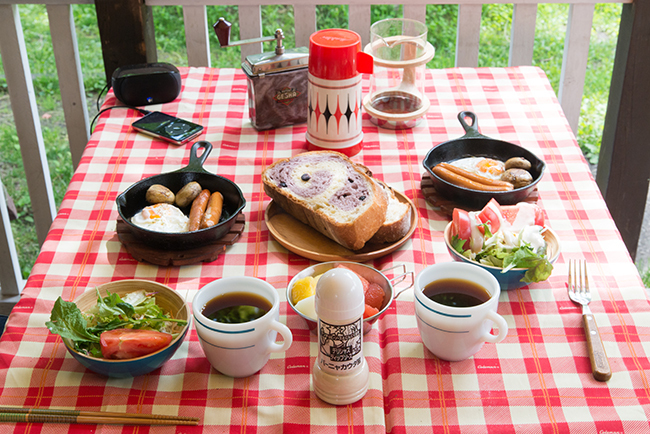 朝食はソーセージエッグにマッシュルームのアヒージョとサラダと浅野屋のパン