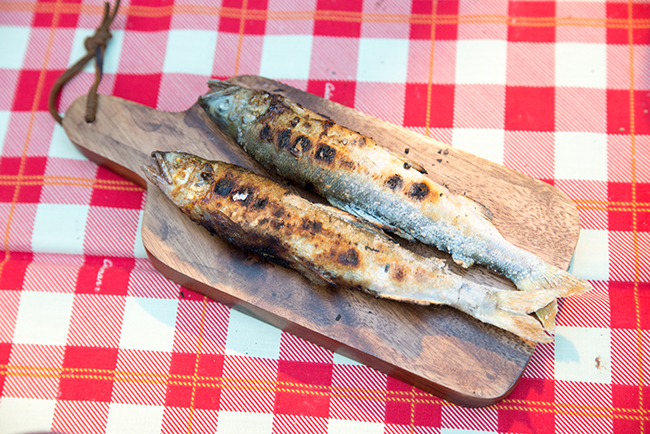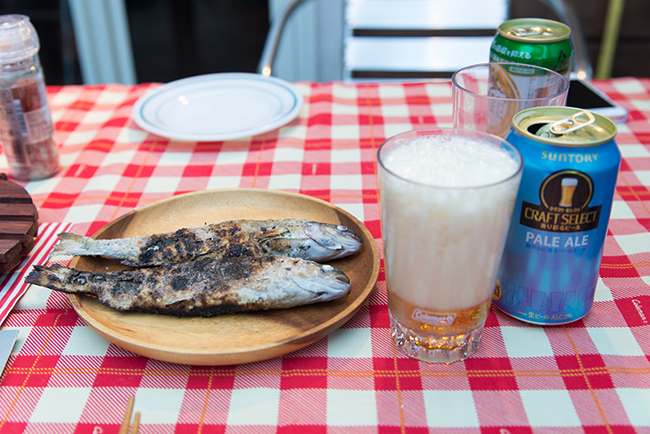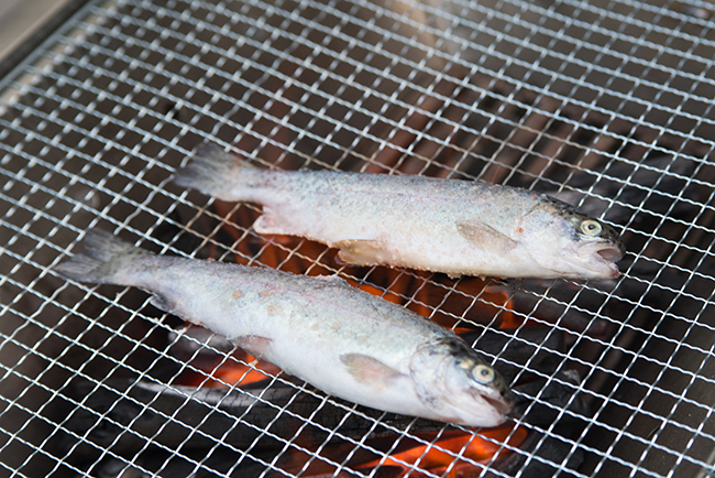 夕飯はTSURUYAで購入した鮎や虹鱒を塩焼きにしたり、野菜を焼いたり