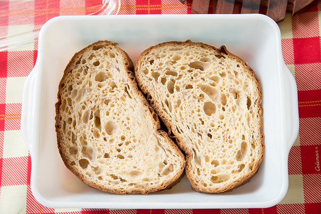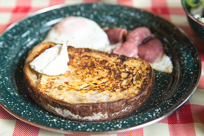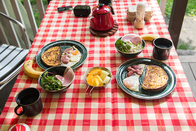 朝食は昨晩から漬けた石窯カンパーニュのフレンチトーストにハムエッグ
