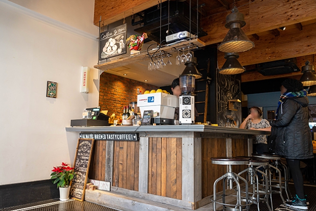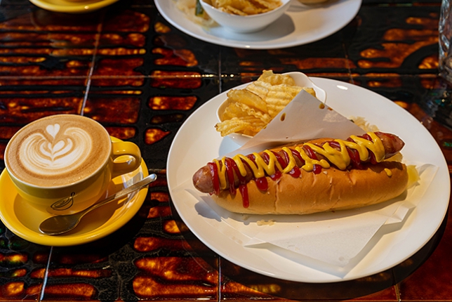 吊り下げられたペンダントライトもお洒落でインテリアの雰囲気も良いですね!オーダー時に支払を済ませて席は自由というスタイルでカフェラテとホットドッグをオーダーしました。席は入口から入って直ぐのソファ席を選びました。