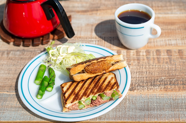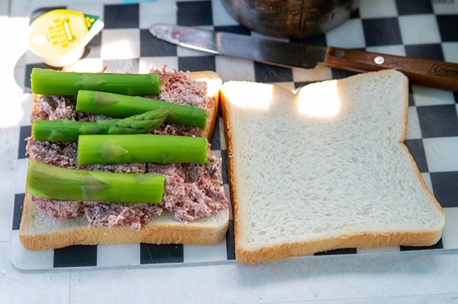 8枚切りの食パンにマヨネーズを塗った上にコンビーフ1缶分を載せて茹でたアスパラガスを載せてパンに挟むだけです。