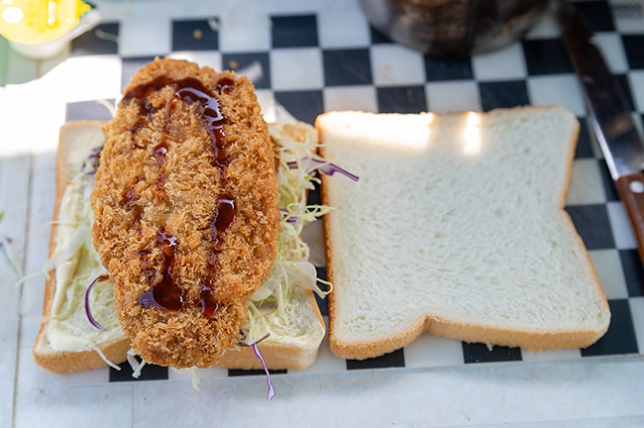 カツサンドはパンにマヨネーズを塗った上に千切りキャベツを載せてソースを掛けた上にトンカツを載せて更にソースを掛けてパンで挟んで焼くだけです。